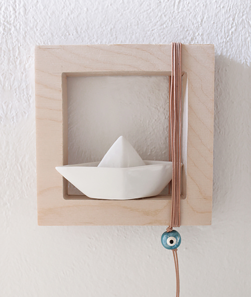 Κάδρο βαρκούλα. Ξύλινη κορνίζα με πορσελάνινη βαρκούλα και κεραμικό μάτι. Διακοσμητικό τοίχου, πρόταση δώρου για κάθε περίσταση και εποχή.