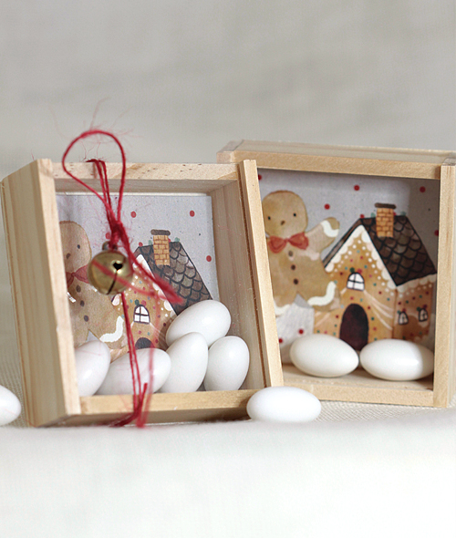 Μπομπονιέρα βάπτισης ζαχαρωτά με κουδουνάκι. Ξύλινο κουτάκι με συρταρωτό καπάκι και εκτύπωση με χριστουγεννιάτικο θέμα. Συνδυάζεται με προσκλητήριο.