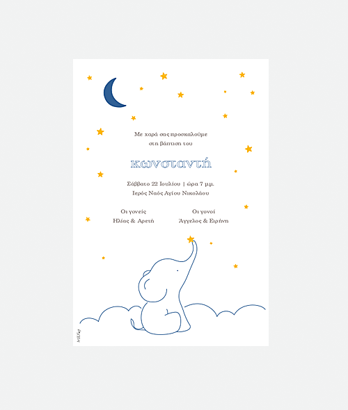 Προσκλητήριο βάπτισης ελεφαντάκι σχεδιασμένο με απλές γραμμές και αστεράκια. Τα προσκλητήρια ArtBeat διακρίνονται για την απλότητα του σχεδιασμού, για το minimal χαρακτήρα και τις προσεγμένες λεπτομέρειες.