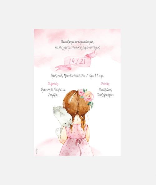 Προσκλητήριο βάπτισης κοριτσάκι με κοτσίδες που κρατάει στον ώμο της λαγουδάκι. Παστέλ χρώματα ακουαρέλας χαρίζουν ρομαντική διάθεση. Συνδυάστε το με μπομπονιέρα βάπτισης όπου προσαρμόζεται το θέμα της επιλογής σας.