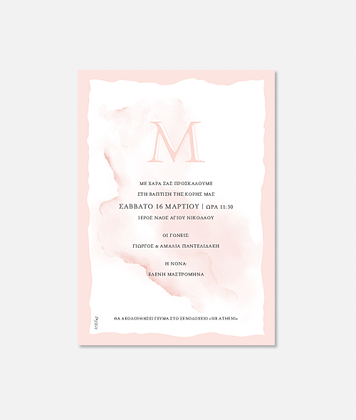 Προσκλητήριο βάπτισης μονόγραμμα σε απαλό φόντο. Ροζ βάση με δεύτερο επίπεδο κομμένο ελεύθερα. Όλα τα προσκλητήρια ArtBeat είναι σχεδιασμένα από το δημιουργικό μας τμήμα και μπορούμε να προσαρμόσουμε τα θέματα σε μπομπονιέρες και άλλα είδη βάπτισης.