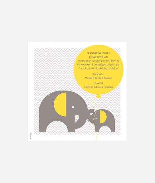 Ετικέτες: γκρι, ελεφαντάκι, κίτρινοΠροσκλητήριο βάπτισης μωρό ελεφαντάκι. Προσαρμόζουμε όλα τα θέματα από τα προσκλητήρια ArtBeat σε λαμπάδα, κουτί, βιβλίο ευχών και kit διακόσμησης.