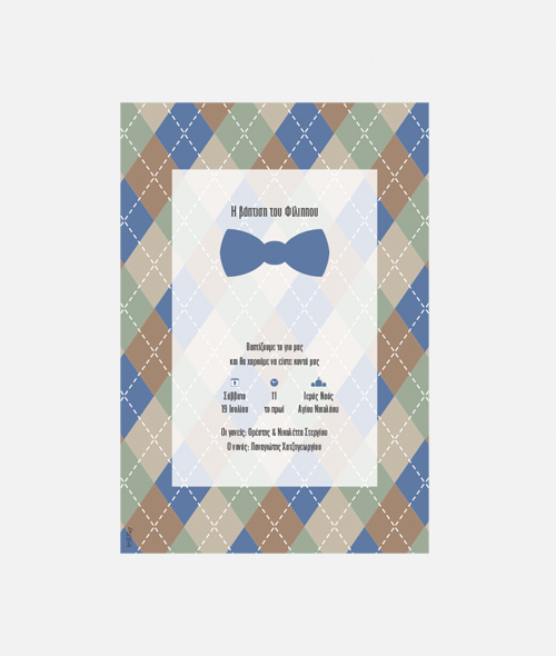 Ετικέτες: modern, stylishΠροσκλητήριο βάπτισης παπιγιόν με ρόμβους σε αγγλικό στιλ. Συνδυάστε το με το μπρελόκ παπιγιόν στα χρώματα της επιλογής σας.
