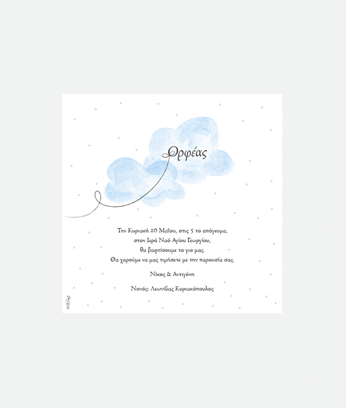 Ετικέτες: it's a boy, παστέλ, σύννεφοΠροσκλητήριο βάπτισης συννεφάκια με όνομα ζωγραφισμένα με χρώματα ακουαρέλας σε πουά φόντο. Οι σαπουνόφουσκες είναι αγαπημένο παιχνίδι για όλα τα παιδιά. Προσαρμόζουμε όλα τα θέματα από τα προσκλητήρια ArtBeat σε πολλού κωδικούς.