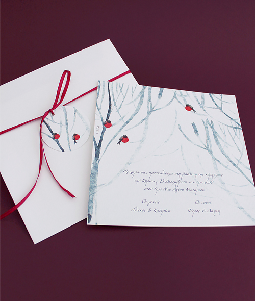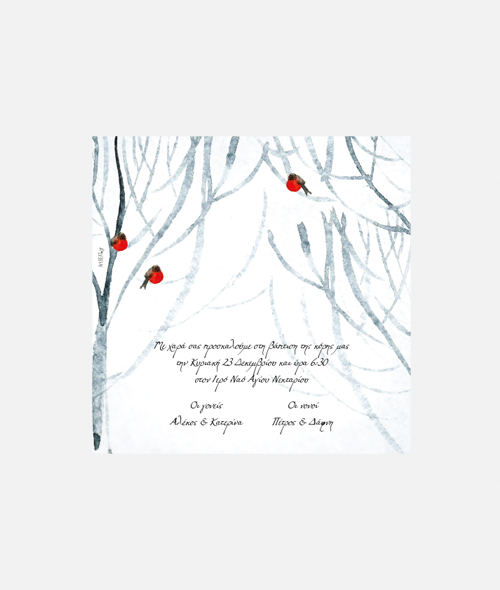 Ετικέτες: winter, πουλάκιΠροσκλητήριο βάπτισης χειμωνιάτικο τοπίο με χιονισμένα δέντρα και πουλάκια. Διακόσμηση με κόκκινο κορδόνι και εξωτερικό καρτελάκι στο φάκελο.