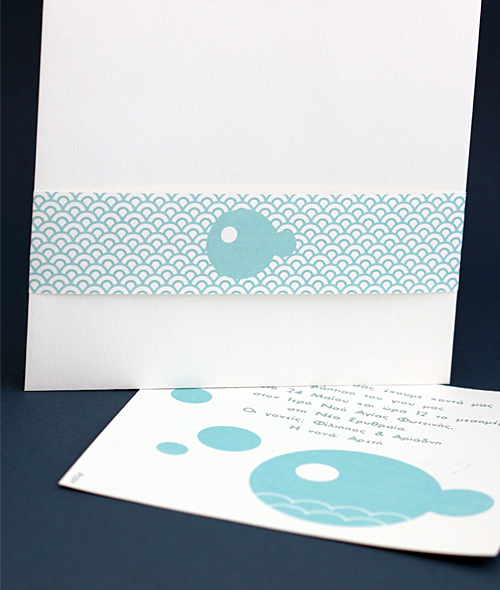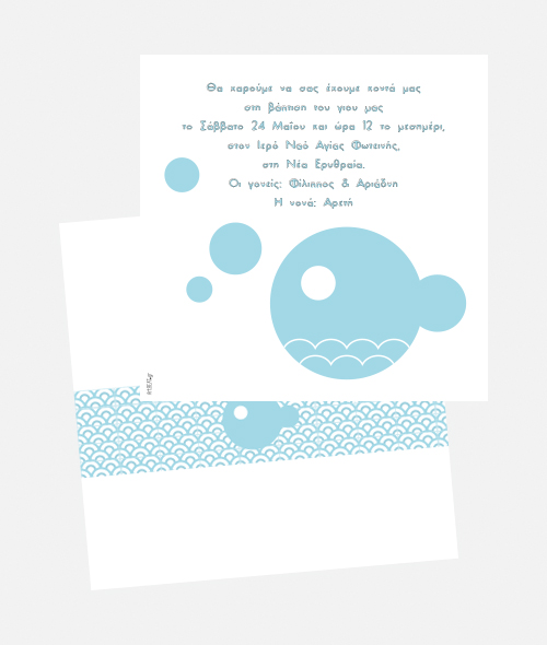 Προσκλητήριο βάπτισης ψαράκι με γραφίστικο χαρακτήρα. Ο φάκελος διακοσμείται με περιμετρική χάρτινη κορδέλα. Συνδυάστε το με τη μπομπονιέρα ψαράκι που περιέχει δωράκι για τους καλεσμένους.