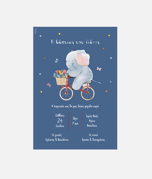 Ετικέτες: it's a boy, προσκλητήριο βάπτισηςΠροσκλητήριο ελέφαντας σε ποδήλατο. Εμπνευστείτε τα δικά σας αγαπημένα χρώματα. Συνδυάστε το με μπομπονιέρα βάπτισης όπου προσαρμόζεται το θέμα της επιλογής σας.